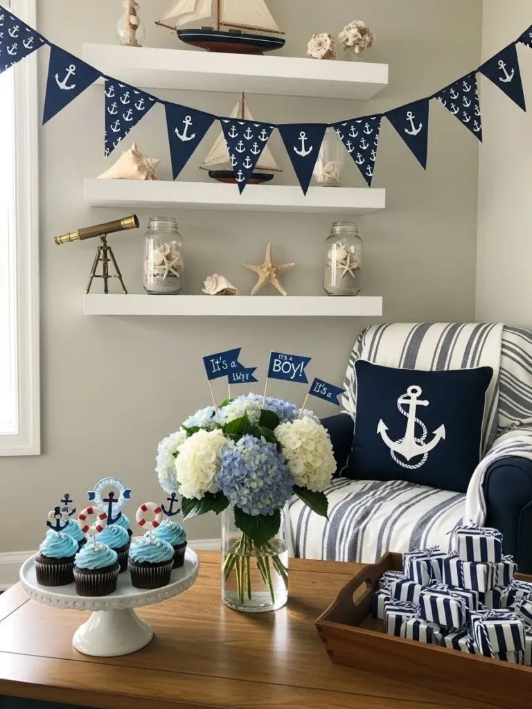 This sweet nautical setup leans into timeless seaside charm with a clean blue and white color palette that feels calm and polished. Anchor patterned bunting stretches across the shelves while sailboats shells and starfish add layered coastal texture without feeling cluttered. A striped armchair with an anchor pillow grounds the space and makes it feel like a cozy little lounge area rather than just party decor. The table styling keeps things playful with frosted cupcakes nautical toppers soft blue hydrangeas and neatly wrapped favors that echo the navy stripes throughout the room.