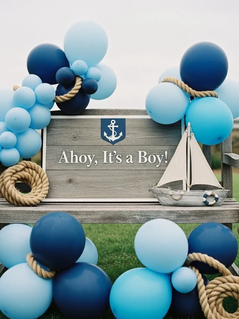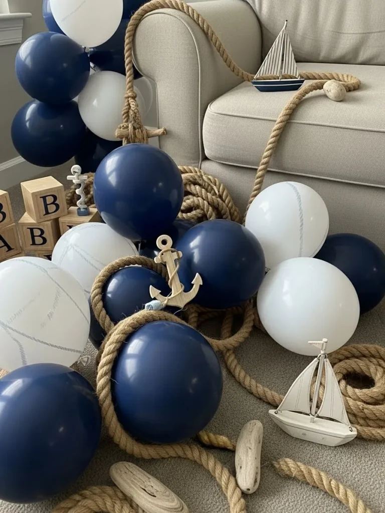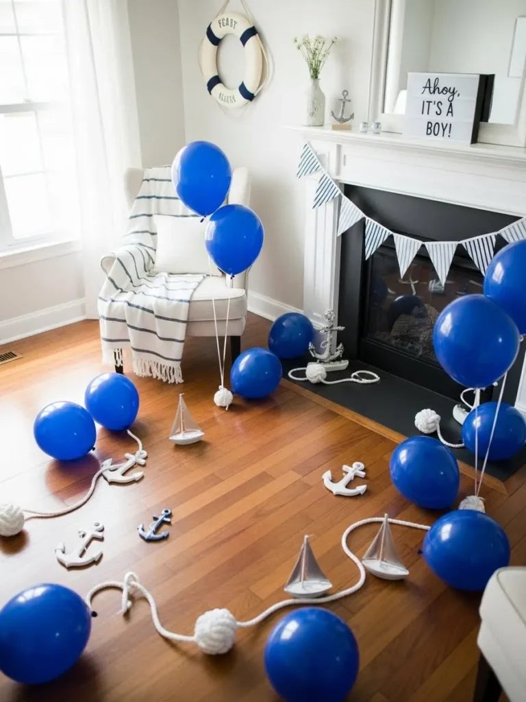 This charming living room setup leans fully into a classic nautical theme while still feeling soft and welcoming. Crisp white walls and warm wood floors create the perfect neutral backdrop for bold navy blue balloons scattered playfully across the space. Nautical details like rope accents, anchor décor, sailboat figurines, and striped bunting instantly set the seaside mood without feeling overdone. The fireplace becomes a sweet focal point with simple banner décor and a cute sign announcing the baby boy theme, while the cozy armchair layered with striped throws keeps everything feeling relaxed and homey.