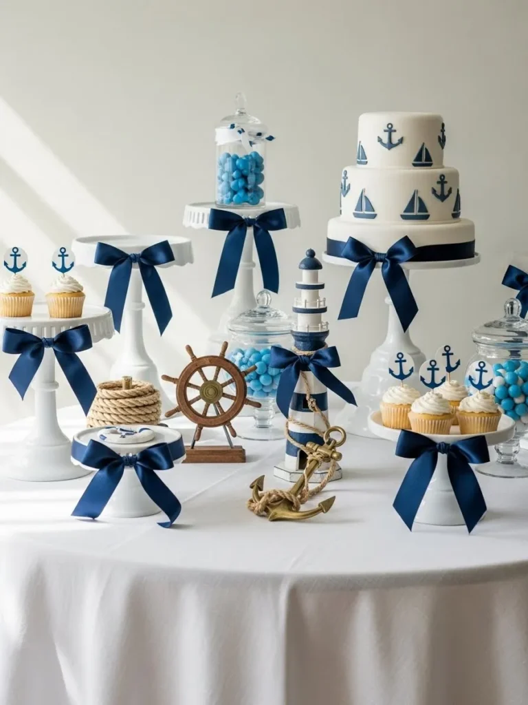 This setup features a beautifully styled dessert table with a crisp nautical theme that feels timeless and polished. White cake stands are layered at different heights and tied with deep navy satin bows which instantly give the table a tailored look. The cakes and cupcakes are decorated with simple anchor and sailboat motifs in soft blue tones that feel sweet without being too themed. Glass jars filled with blue candies add a pop of color while decorative elements like a wooden ship wheel rope accents and a striped lighthouse bring in that seaside charm. Everything sits against a clean white backdrop which keeps the whole display light airy and classic.