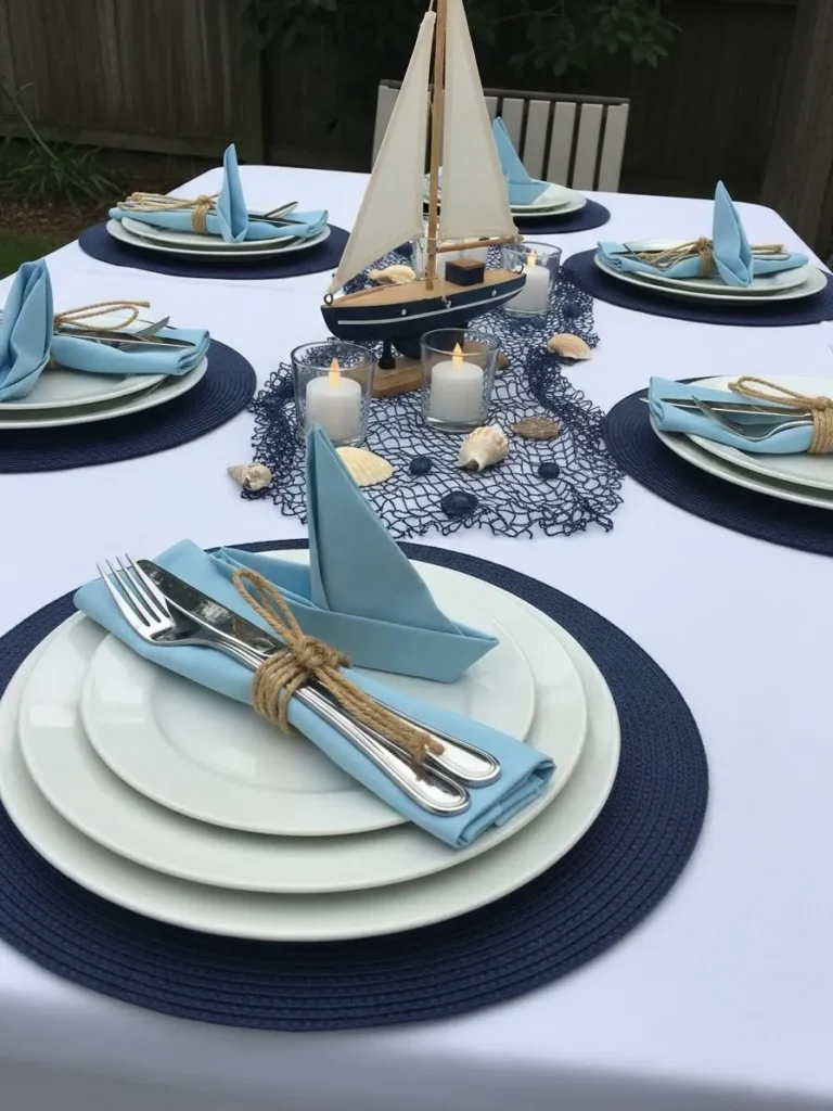 This table setting leans fully into that timeless nautical look with crisp white linens paired with deep navy placemats that instantly ground the whole setup. Soft blue napkins are folded into little sailboat shapes and tied with natural rope which feels playful without being over the top. Layered white plates keep everything clean and classic while small coastal touches like shells a fishing net runner and glass candles add texture right down the center. The sailboat centerpiece ties it all together and feels charming rather than theme park cute which is always the goal.