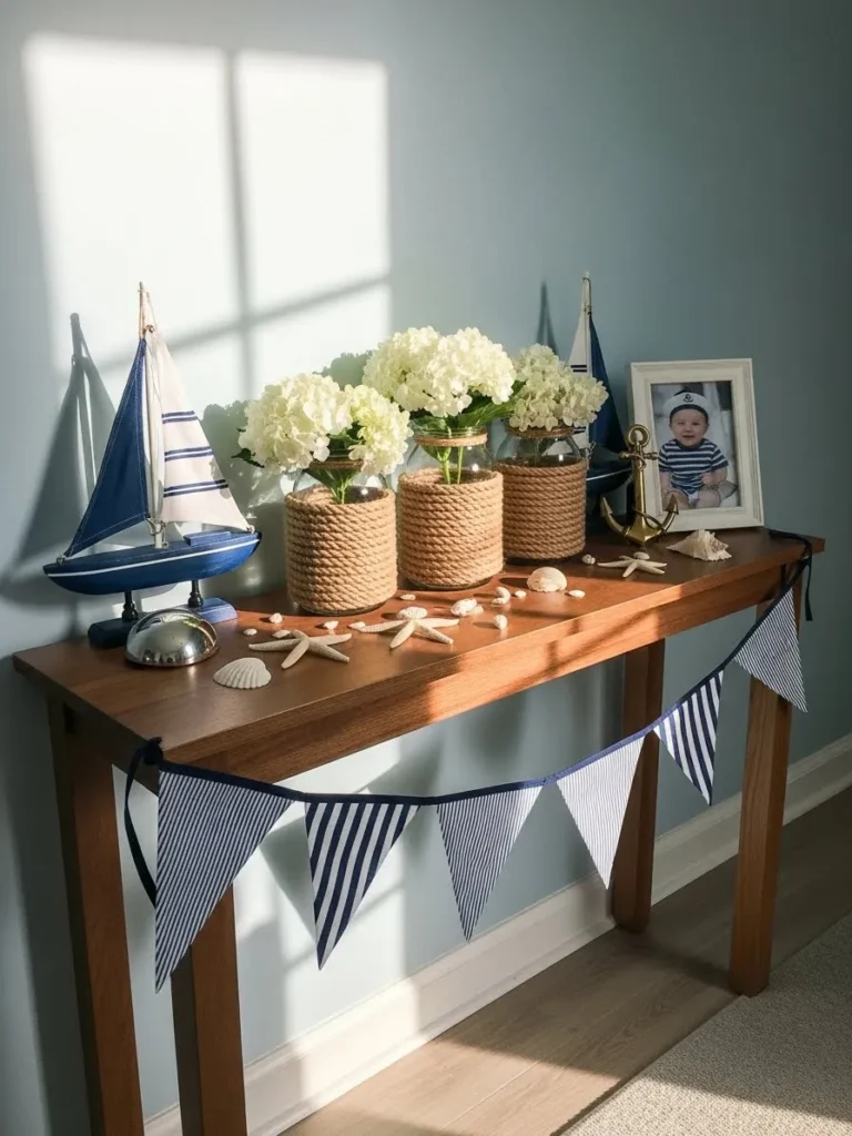 This sweet nautical setup features a warm wooden console table styled with timeless seaside details that feel cozy and intentional. Soft blue walls create a calm backdrop while miniature sailboats add a playful nod to classic nautical style. Rope wrapped glass vases filled with fluffy white florals bring in texture and warmth without feeling fussy. Scattered seashells and starfish keep the look light and charming while a framed baby photo and anchor accent add a personal touch that feels just right for a baby shower.