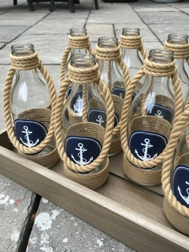 These charming glass bottle lanterns bring in that easy coastal vibe with clear glass, chunky rope handles, and sweet navy anchor details on the front. The bottles sit neatly in a simple wooden tray which makes them feel styled but still relaxed. I love how the natural rope texture softens the look while keeping everything very nautical and classic. They feel perfect as table accents or lined up near an entry for a baby shower that wants subtle seaside charm without going overboard.