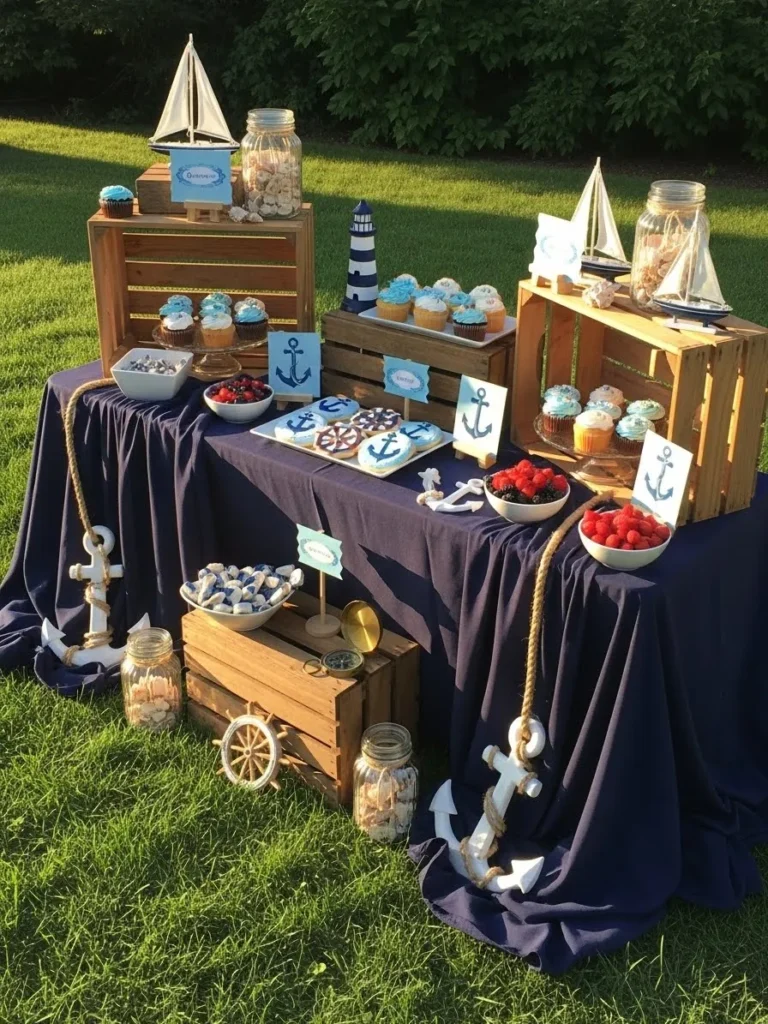 This nautical dessert table feels charming and thoughtfully layered with soft coastal details that instantly set a relaxed seaside mood. Wooden crates are stacked at different heights to create visual interest while keeping everything easy and approachable. Navy table linens anchor the look and let the lighter accents shine like sailboats, anchors, seashell jars, and rope details. The treats are simple but adorable with frosted cupcakes, anchor themed cookies, and bowls of fresh berries that add pops of color. Everything feels balanced and intentional without looking too staged which is exactly what makes it work so well outdoors.