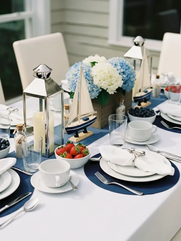This nautical table setup feels crisp and timeless with its clean white tablecloth layered with deep navy placemats and soft blue accents. Mini sailboats anchor the theme without feeling overdone while glass lanterns add a gentle glow that works beautifully for daytime or evening gatherings. Blue and white hydrangeas bring in that coastal freshness and the simple white dishware keeps everything looking polished and calm. Little bowls of berries and clear glassware make the table feel welcoming and ready for guests to linger.