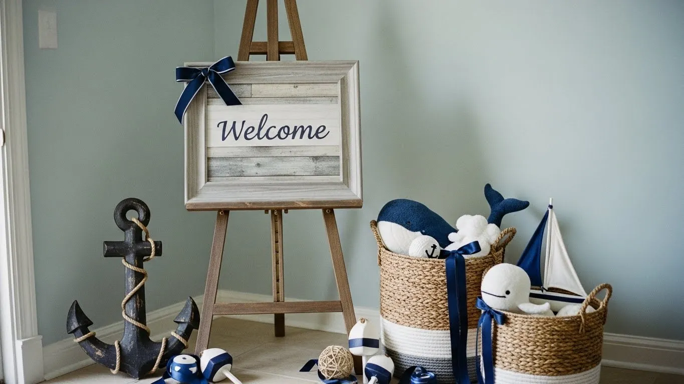 This setup leans fully into timeless nautical charm with a crisp white welcome sign framed by navy ribbons and soft striped bows. Weathered wooden anchors are layered around the sign and grounded with woven baskets filled with cozy textiles in navy and white. The mix of rope details, natural wood textures, and clean typography keeps everything feeling classic rather than themed in an over the top way. It feels balanced and intentional, like every piece belongs without trying too hard.