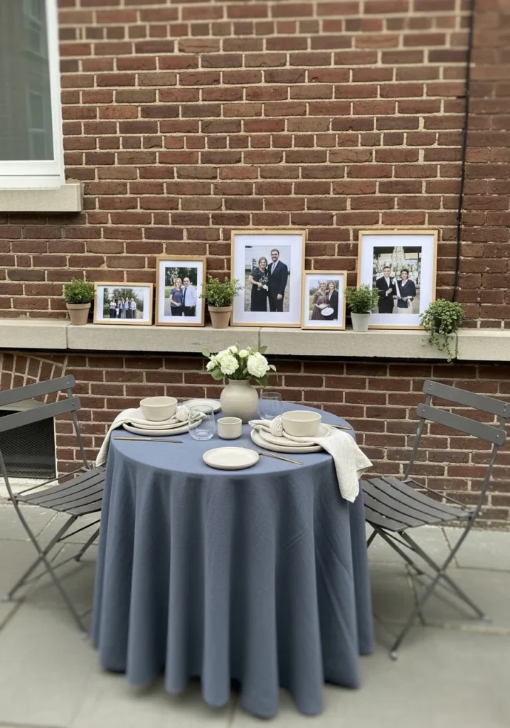 This small round table is styled with framed photos, soft linens, and subtle florals. The setup feels personal and reflective, inviting guests to pause and look closer. Everything feels intentional and calm.