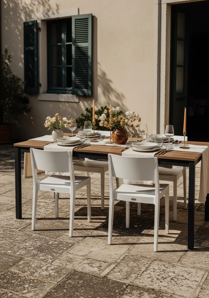 This dining table is placed in a quiet courtyard with light furniture and simple styling. The clean layout keeps the focus on the gathering rather than the surroundings. Everything feels calm and intentional.