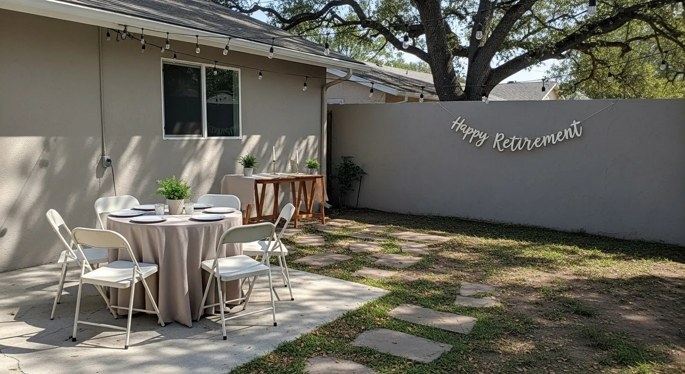 This patio table is styled simply and framed with a small banner that marks the occasion. The layout feels open and friendly, with enough space for guests to move around easily. It feels celebratory without being overdone.